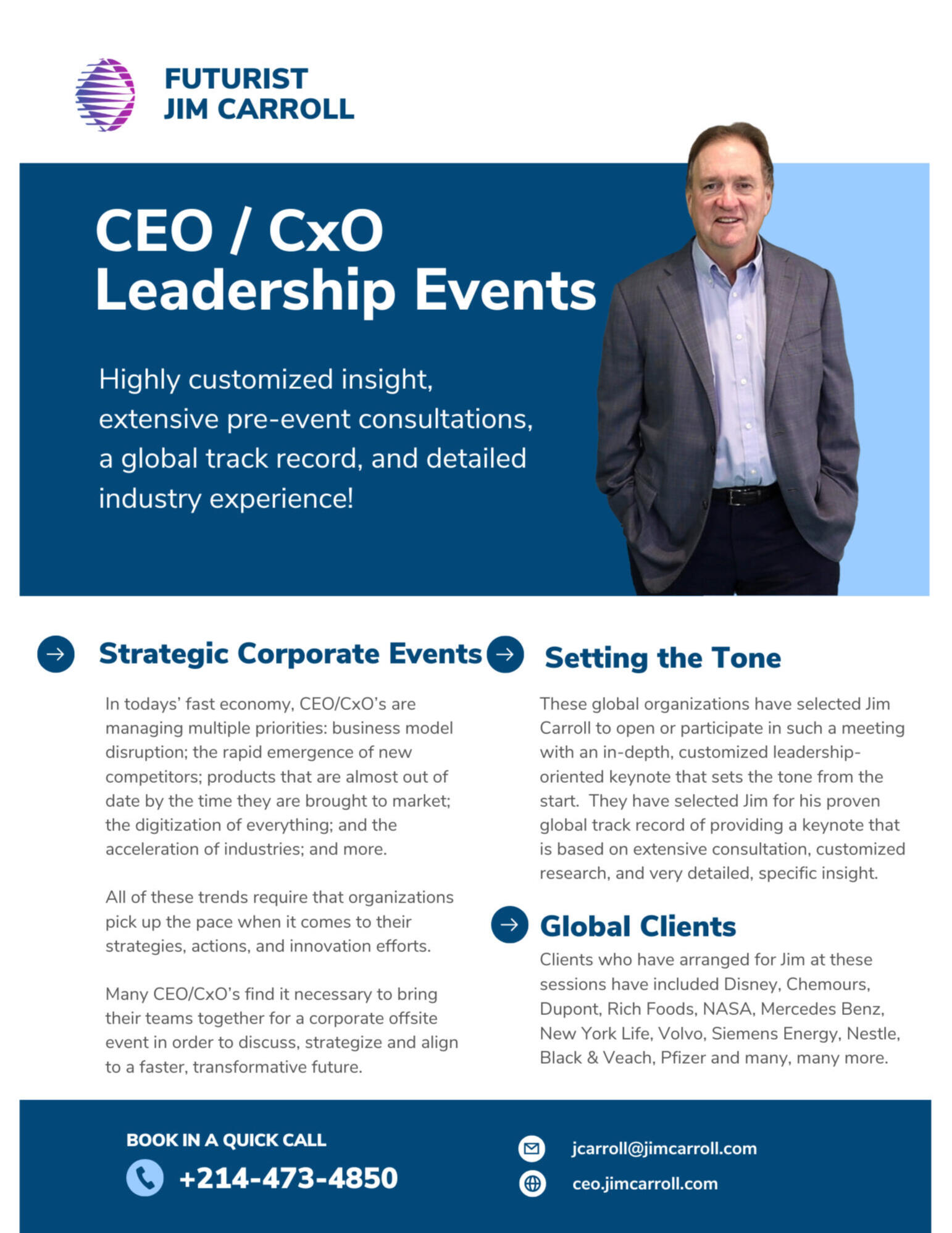 For 30+ years, Futurist Jim Carroll has been on a mission to help organizations understand how to align to tomorrow, today.Jim Carroll is the futurist that CEOs trust. His global client list demonstrates that they seek his accumulated 30 years of experience, wisdom, and insight, developed by the time he has spent with some of the leading organizations in the world.Jim’s leadership keynote will align you to your disruptive, accelerating future by providing detailed, specific industry trends. It’s powerful leadership insight delivered in a compelling and motivational style!You know you need to align to a world that is faster, more complex, and that demands resilience. You need deep insight into the trends that will impact you and the strategies that you can pursue to align with them. You need to inspire your leadership team and members to get moving. That’s how Jim Carroll will help you.Don’t just take Jim’s word for it. Join other leading organizations like NASA, Pfizer, The World Bank, Mercedes Benz, the PGA, Blackrock, the Wall Street Journal, and even Disney, all of whom arranged for Jim’s insight for a global leadership event or customer meeting – and came away empowered with new insight to take on our faster, more complex world.
